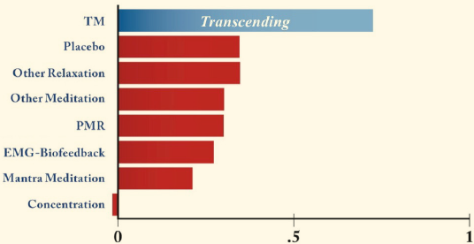 La investigación científica muestra que el programa de Meditación Trascendental es dos veces más eficaz que otras técnicas de relajación o reducción del estrés para reducir la presión arterial y la ansiedad, aumentar la relajación física, mejorar el funcionamiento mental y disminuir el consumo de cigarrillos, alcohol y drogas.