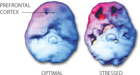 Pero cuando el cerebro está estresado (imagen a la derecha) vemos lo que se llama “agujeros funcionales” en el cerebro. Estos no son hoyos reales, sino áreas del cerebro, incluida la corteza prefrontal, que no participan activamente en el pensamiento y la toma de decisiones.