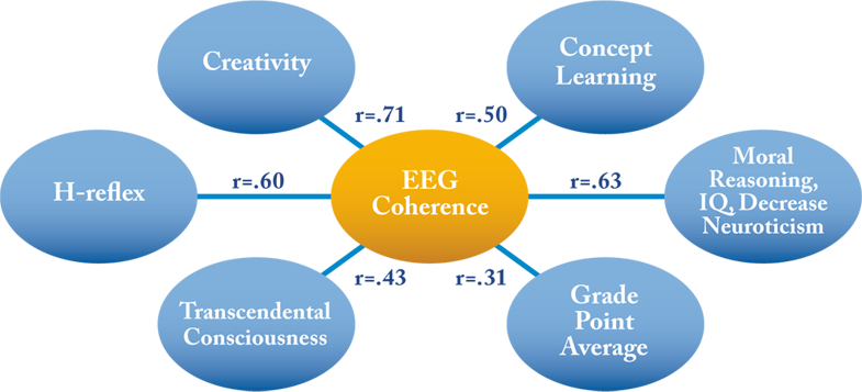 Los investigadores descubrieron que durante la práctica de la técnica de la Meditación Trascendental, el cerebro se vuelve más coherente e integrado. Los hemisferios izquierdo y derecho del cerebro comienzan a trabajar más juntos. La coherencia de las ondas cerebrales entre los hemisferios, o entre la parte frontal y posterior, aumenta.