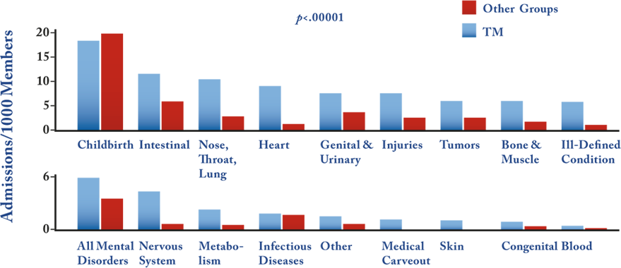 La Meditación Trascendental reduce el estrés traumático y cambia el funcionamiento del cerebro de un individuo. Las meditaciones grupales de MT han demostrado reducir el estrés social, el crimen y la violencia social.